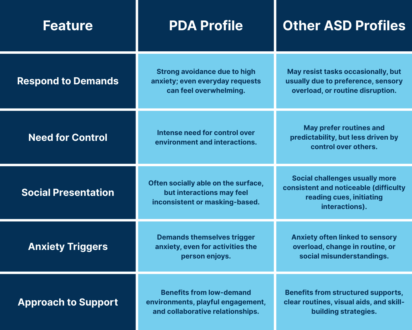 While PDA is part of the autism spectrum, it stands out because of the extreme anxiety-driven need to avoid demands—even ones that are enjoyable or self-imposed. Unlike other autistic profiles that may show rigidity or sensory sensitivities as primary challenges, PDA centers on demand avoidance, control-seeking behaviors, and social strategies that can mask deeper struggles.