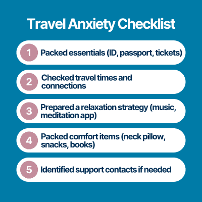 Break travel into steps: Focus on one part of the journey (packing, checking in, boarding) instead of the entire trip at once.